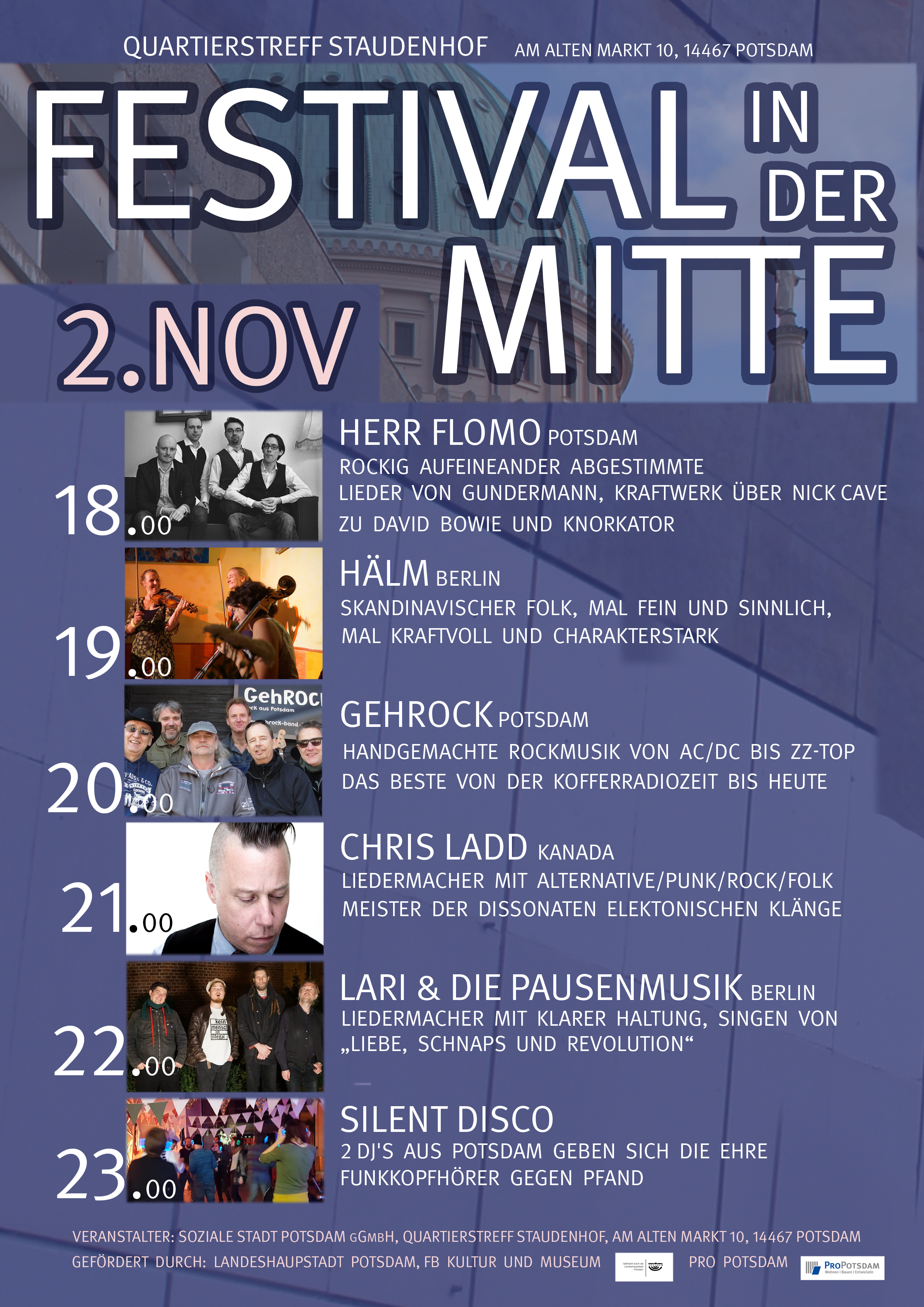 Das Festival in der Mitte findet am 1. & 2. 11.2019 zum zweiten Mal statt. Den Anfang macht die große Salsa-Eröffnungsparty und leitet damit die Salsa-Wintersaison im Quartierstreff Staudenhof ein. Dabei sind Mayelis & Band, DJ Reza und alle die Lust haben dem November-Blues zu entgehen und die Hüften kreisen zu lassen. Tags darauf wird es rockig, folkig und zwei DJs aus Potsdam laden ein zur ‚Silent Disco’! Dazu gibt es an beiden Tagen leckeren Glühwein, Punsch, frische Waffeln und Gegrilltes. Der Eintritt ist frei!