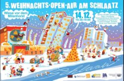 Das zauberhafteste Fest im Jahreslauf – das WeihnachtsOpenAir im Schlaatz - findet in diesem Jahr am 14. Dezember 2019 ab 15.30 Uhr statt. Viele hundert Lichter verwandeln die Wiese am Milanhorst in ein funkelndes Wunderland, im warmen Märchenzelt wird von fernen Ländern erzählt, auf der großen Bühne gibt es Bands und Weihnachtslieder zum Mitsingen. Lassen Sie sich von unserem Weihnachtsmann beschenken oder kaufen Sie ein Los der Tombola – Jedes Los gewinnt. Dampfende Töpfe mit hausgemachter Suppe, Punsch und Glühwein halten Sie warm bis zum traditionellen Abschluss mit dem Liedermacher Robert Bernier und seinem Wunschprogramm zum Mitsingen.