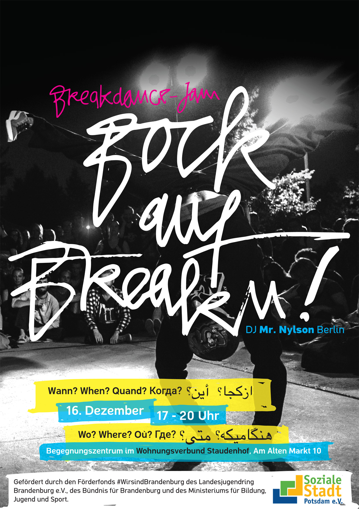 Die große “Jam Dance" Abschlussveranstaltung, bei der die Teilnehmer des Breakdance Kurses "Bock auf Breakn?" zeigen was sie drauf haben, findet am 16. Dezember 2016 um 17.00 Uhr im Wohnungsverbund Staudenhof statt und ihr seid herzlich eingeladen!