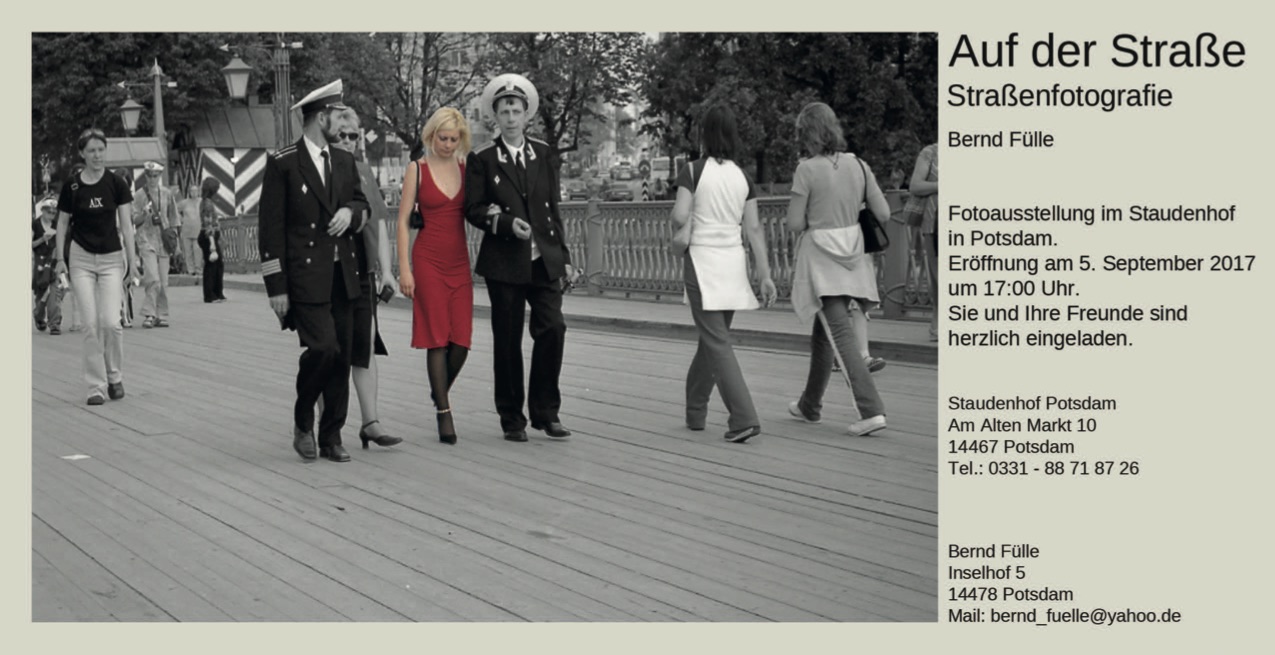 Die Ausstellungseröffnung 'Auf der Straße' mit Fotografien von Bernd Fülle findet am 05. September 2017 um 17.00 Uhr statt. Es ist eine herzliche Einladung in den Wohnungsverbund Staudenhof zu kommen!