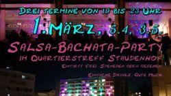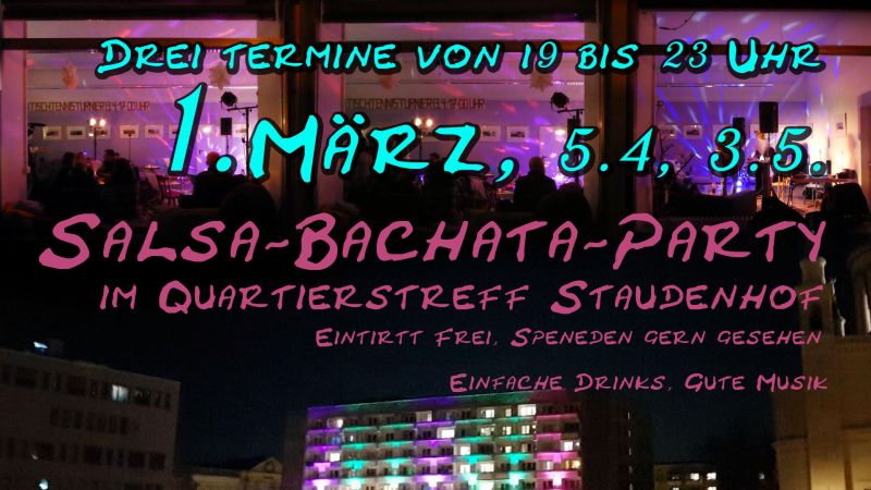 Trainer Reza Bayat lädt alle Interessierten am 13.09.2019 zu einem geselligen Salsa-Abend in den Quartierstreff Staudenhof ein. Von 19.00 bis 23.00 Uhr kann nach Herzenslust getanzt werden! Wir bitten um Spenden für Getränke und Knabbereien. Jede_r ist herzlich willkommen!