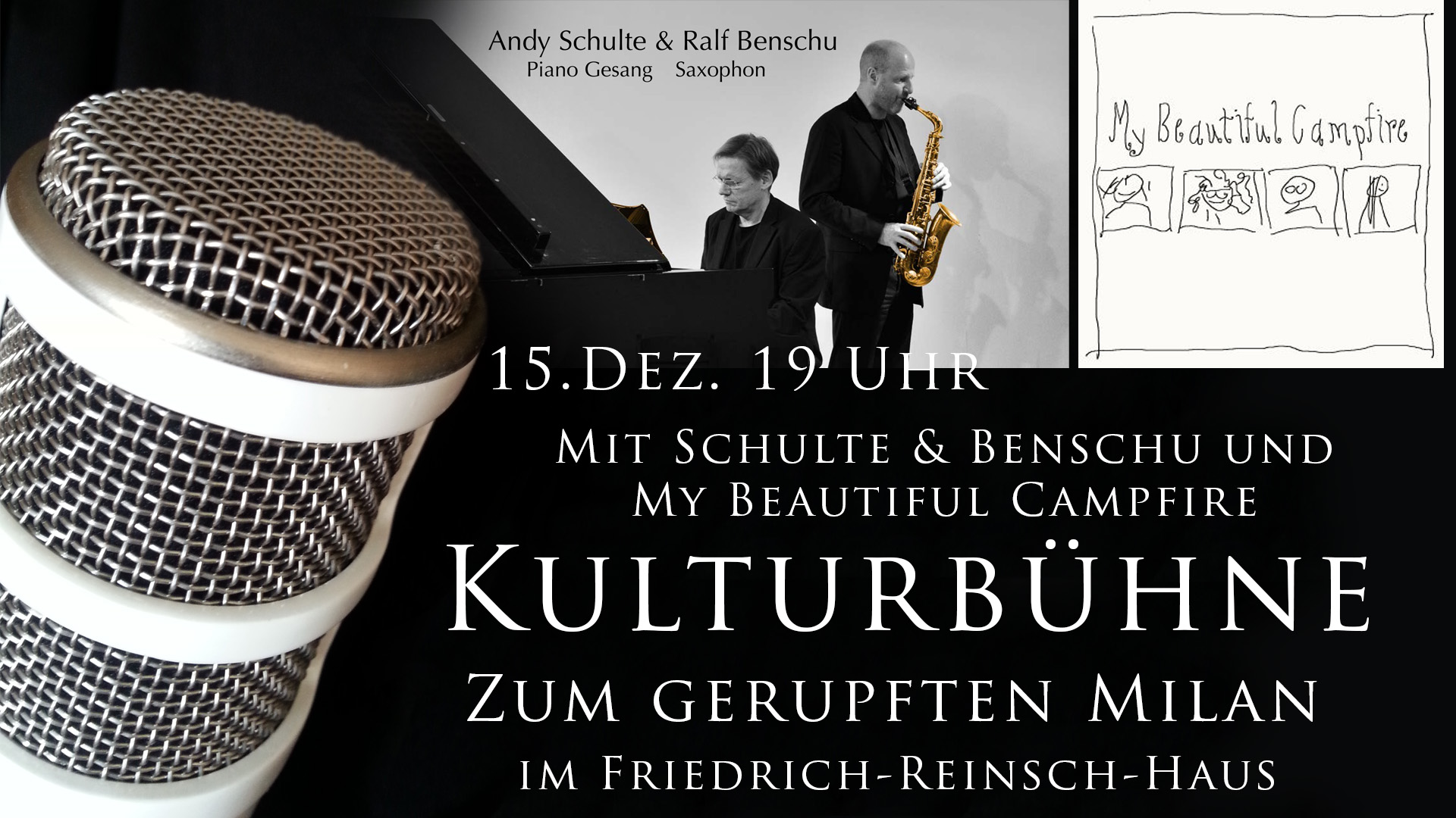 15. Dezember 2017 wieder ihre Türen. Seien Sie gespannt, kommen Sie vorbei, sagen Sie es weiter und freuen Sie sich auf einen tollen Abend im Wohnzimmer des Schlaatzes, im Friedrich-Reinsch-Haus! Beginn ist um 19.00 Uhr! Diesmal mit dabei: Schulte & Benschu und die Band My Beautiful Campfire!